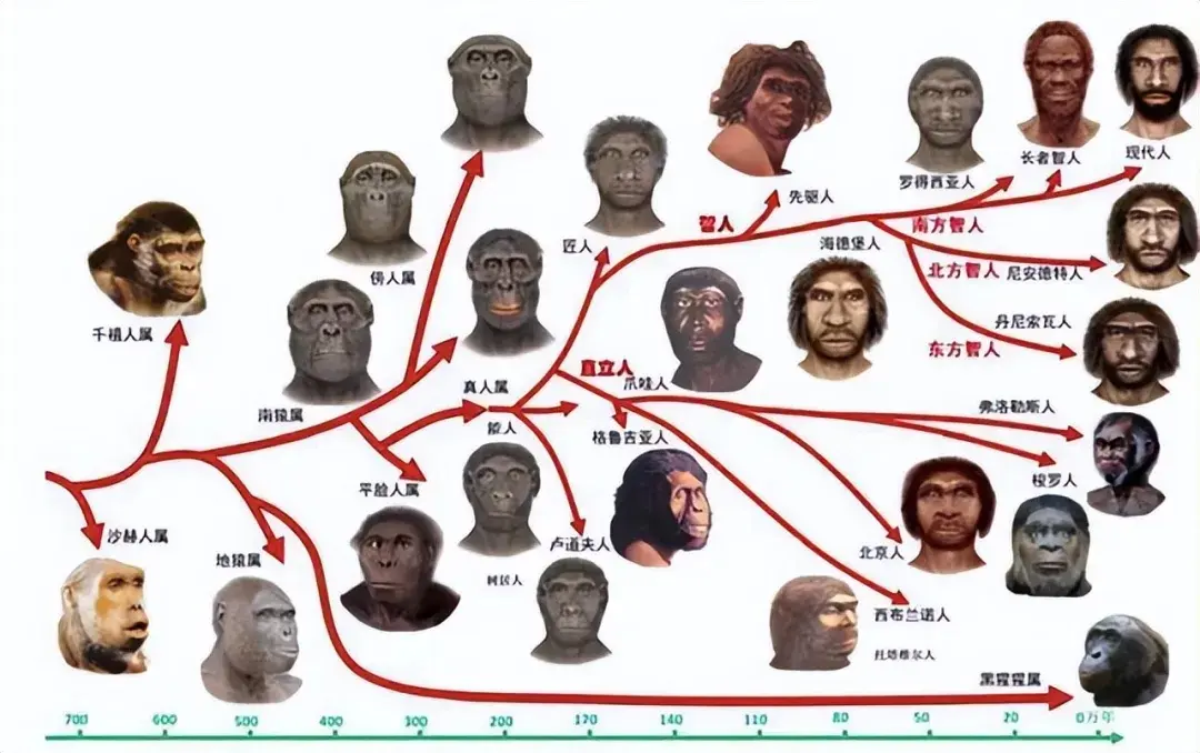 但实际上,这种图示并不严谨。在古猿进化到人类的过程中,实际上分化出了许多其他人种。古猿的进化过程更像是一棵树或一个圈,有着众多的分支。